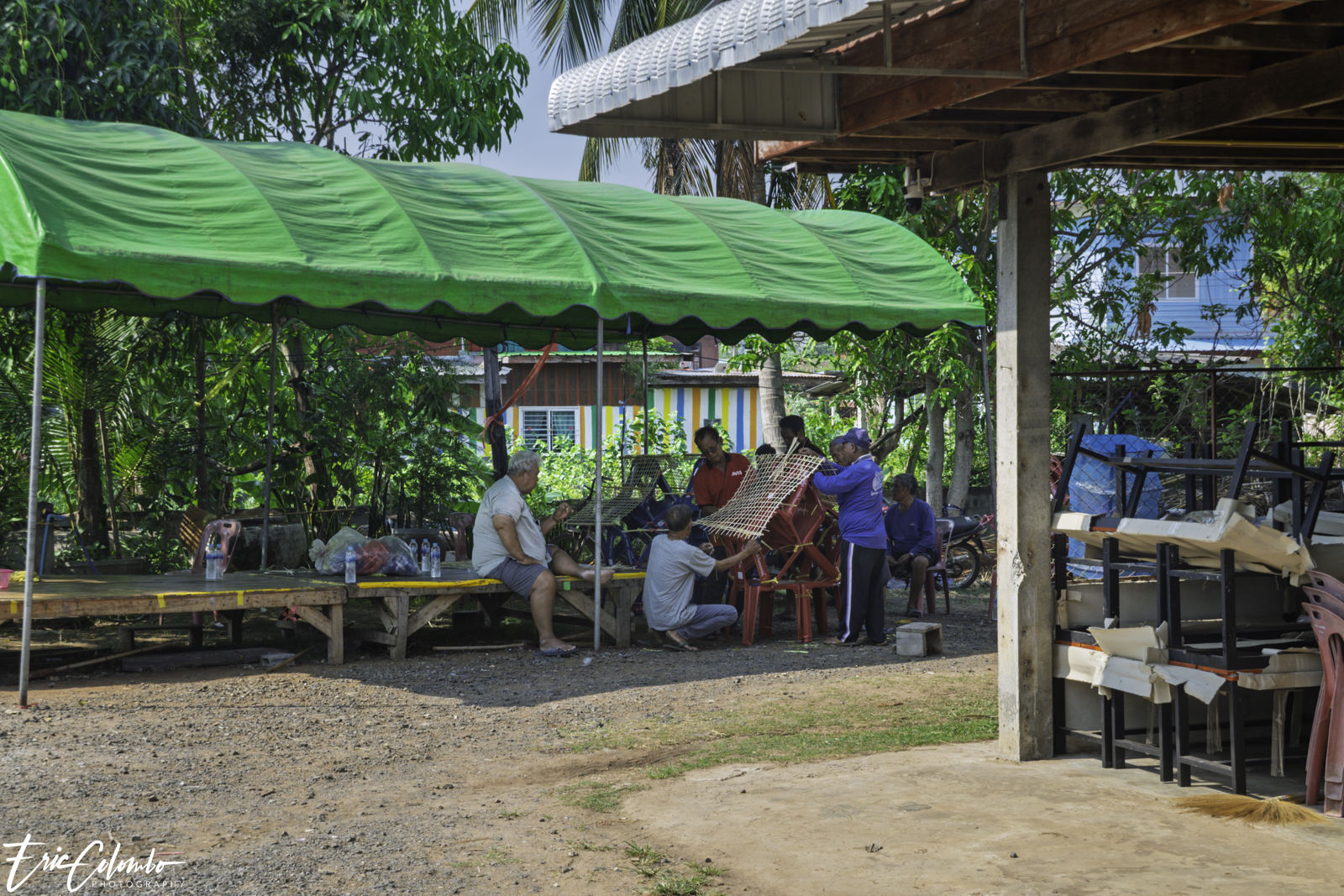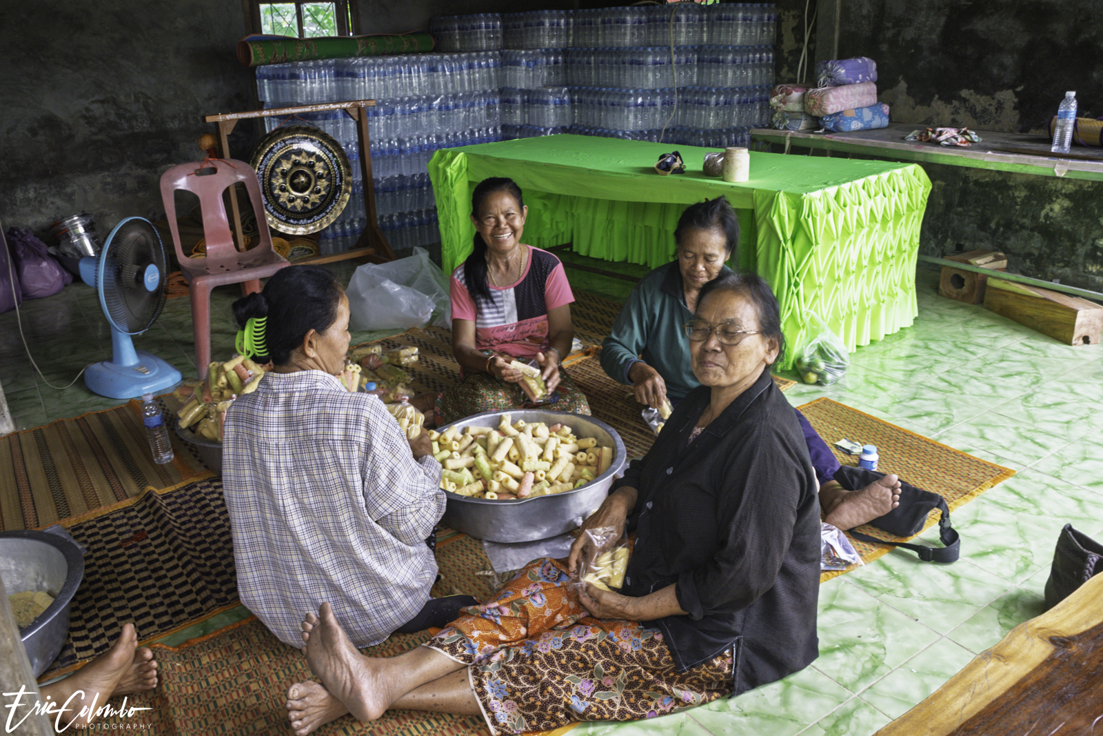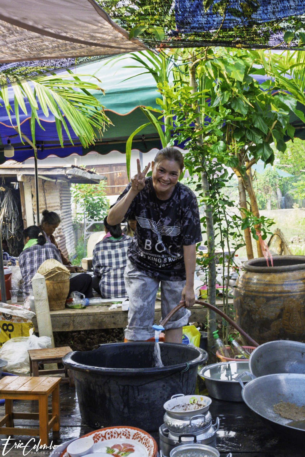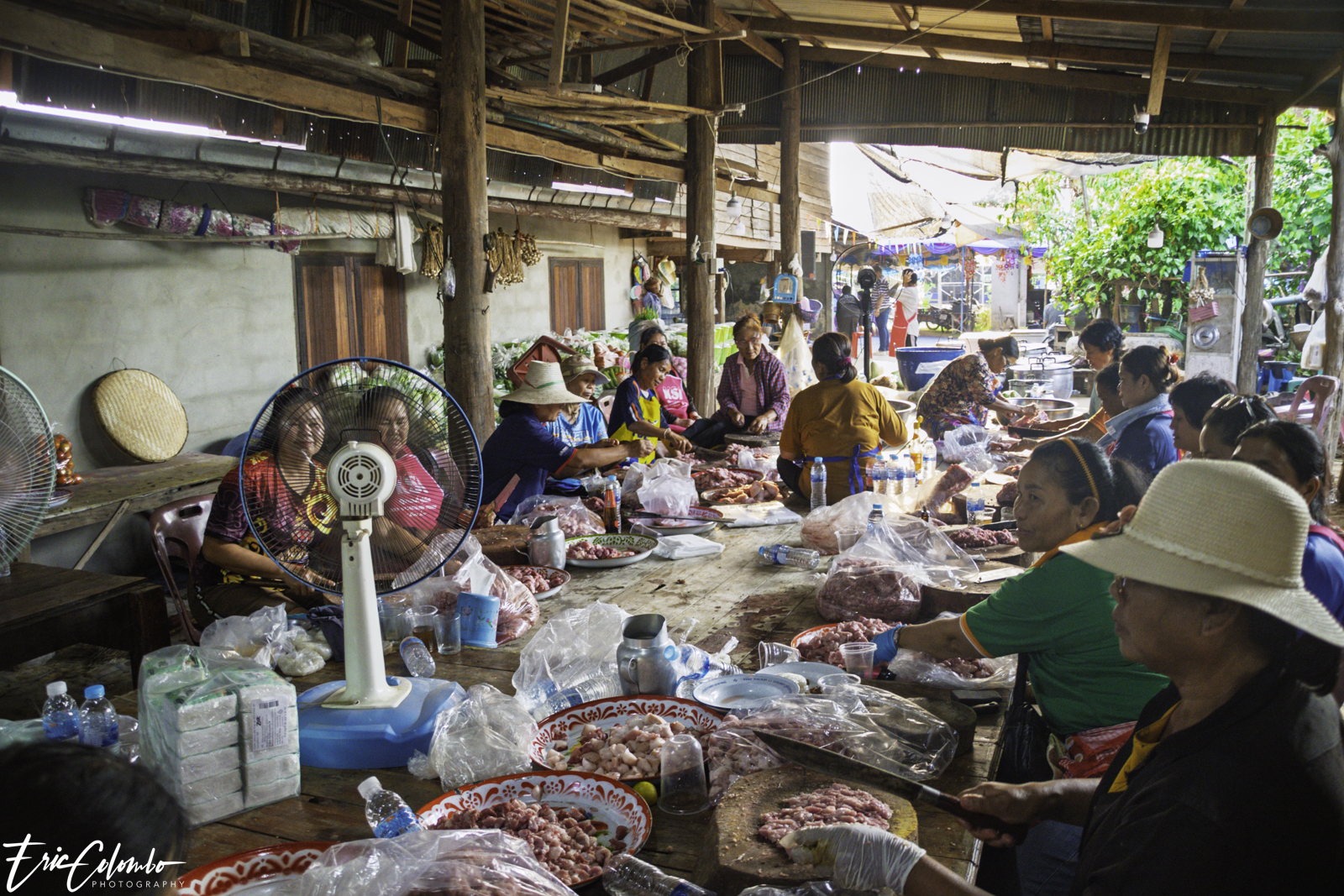Non seulement toute la famille travaillait d'arrache-pied, mais une multitude de villageoises étaient également venues prêter main-forte. Une équipe éminçait la viande, tandis qu’une autre pelait et coupait les légumes. Cette belle organisation a été orchestrée par Nit et son frère Thom, ainsi que par deux autres sœurs, soit les quatre plus jeunes de la fratrie.