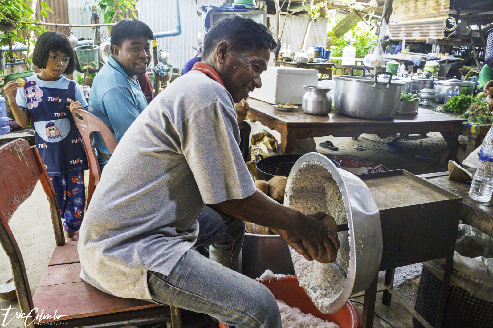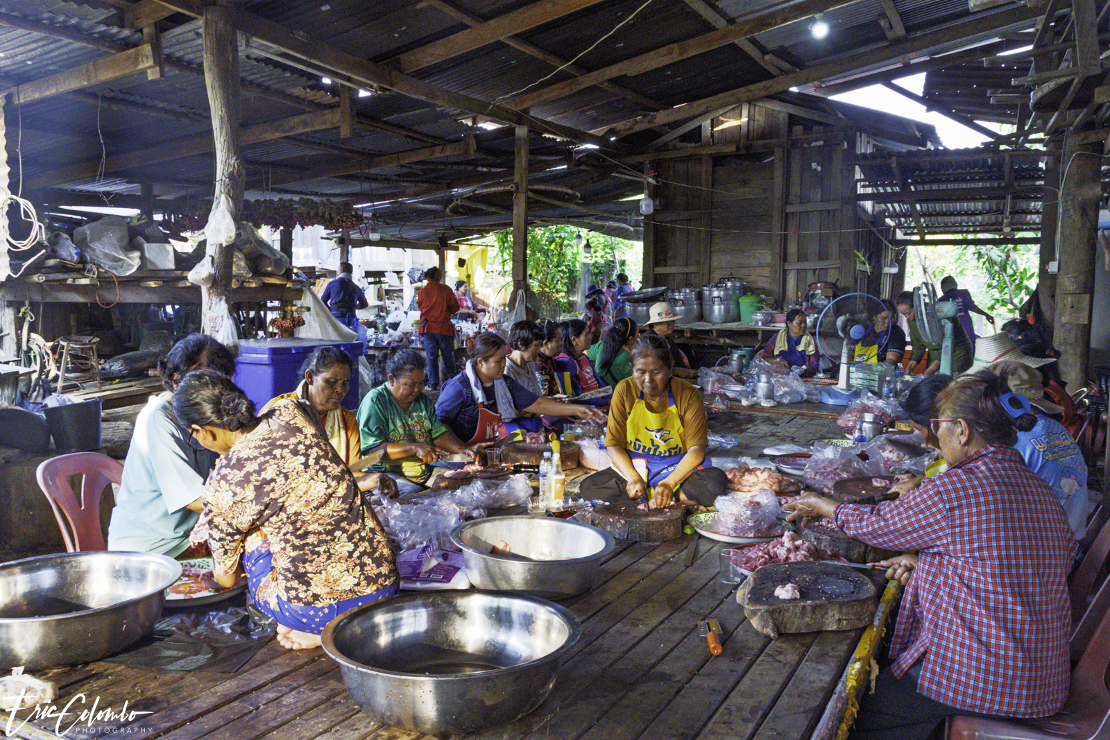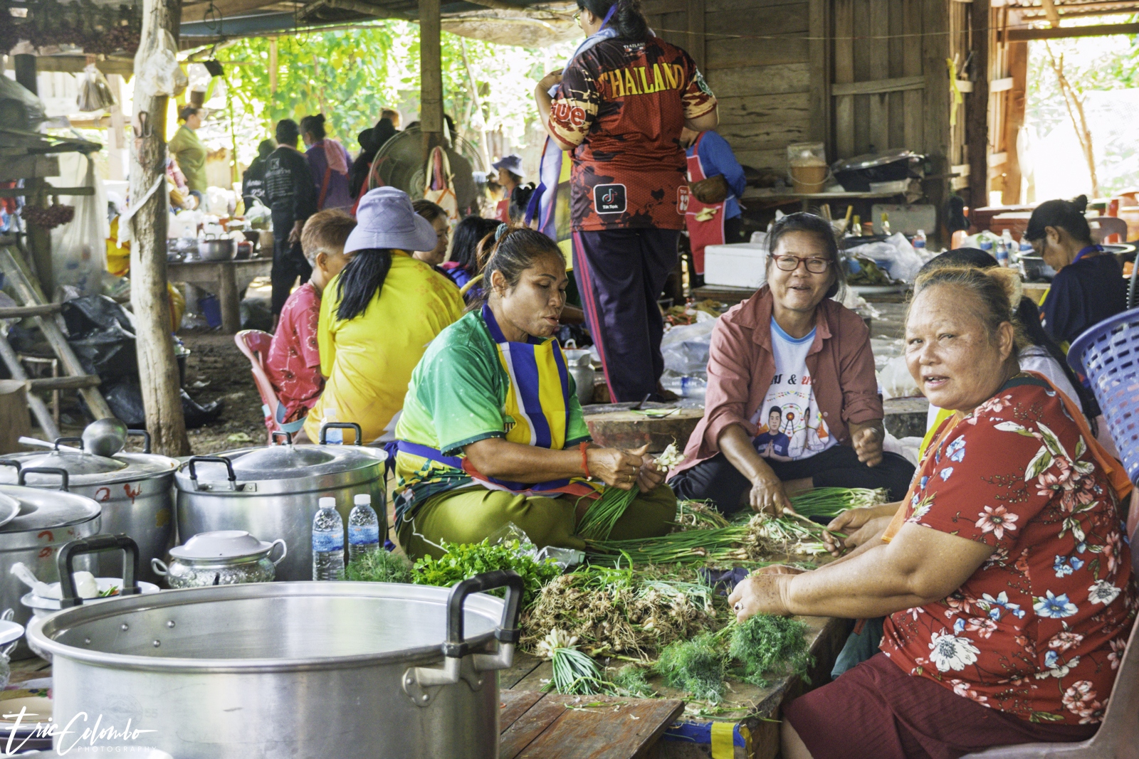 Non seulement toute la famille travaillait d'arrache-pied, mais une multitude de villageoises étaient également venues prêter main-forte. Une équipe éminçait la viande, tandis qu’une autre pelait et coupait les légumes. Cette belle organisation a été orchestrée par Nit et son frère Thom, ainsi que par deux autres sœurs, soit les quatre plus jeunes de la fratrie.