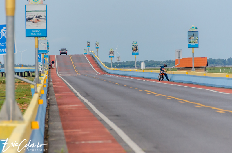 Nous avons traversé le lac jusqu’au pont Ekachai qui est le plus long pont de Thaïlande. Il part de Thale Noi, du district de Khuan Khanun, de la province de Phatthalung au district de Ranot, de la province de Songkhla. L’ancienne route en terre était constamment inondée d’où le besoin de la surélevée d’environ 5 mètres. Beaucoup de touristes prenant cette route ne peuvent s’empêcher de s’arrêter sur les nombreuses places prévues à cet effet pour prendre des photo ou admirer les buffles des marais accompagnés d’oiseaux en tout genre.