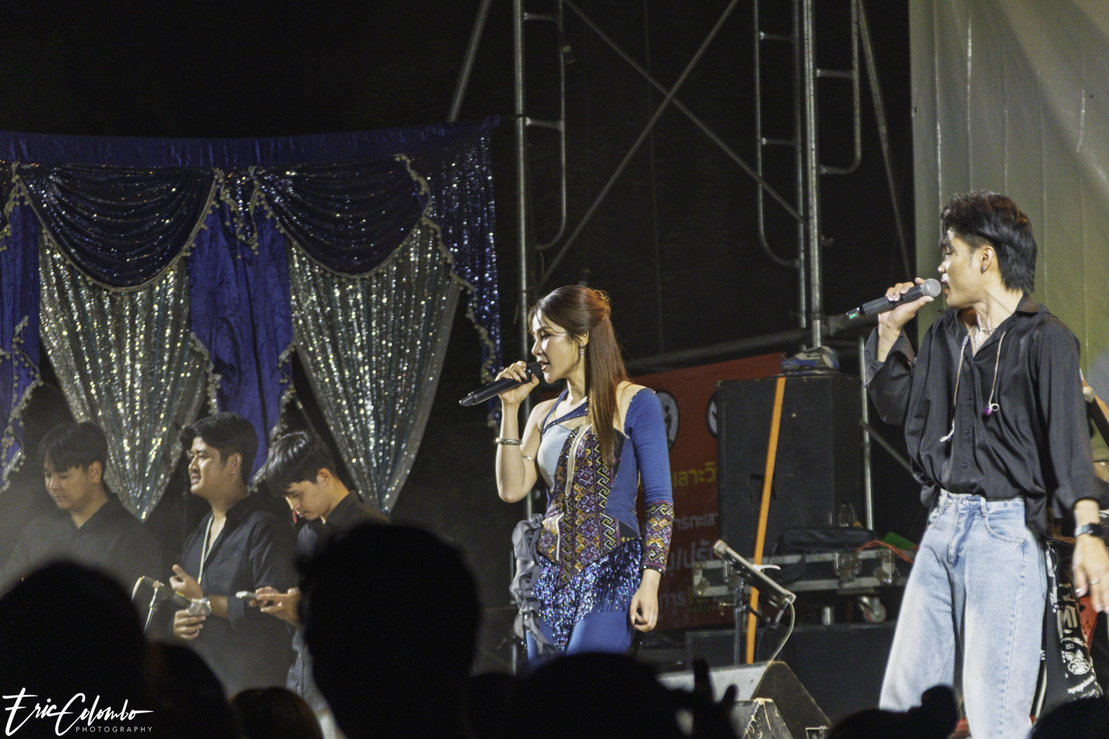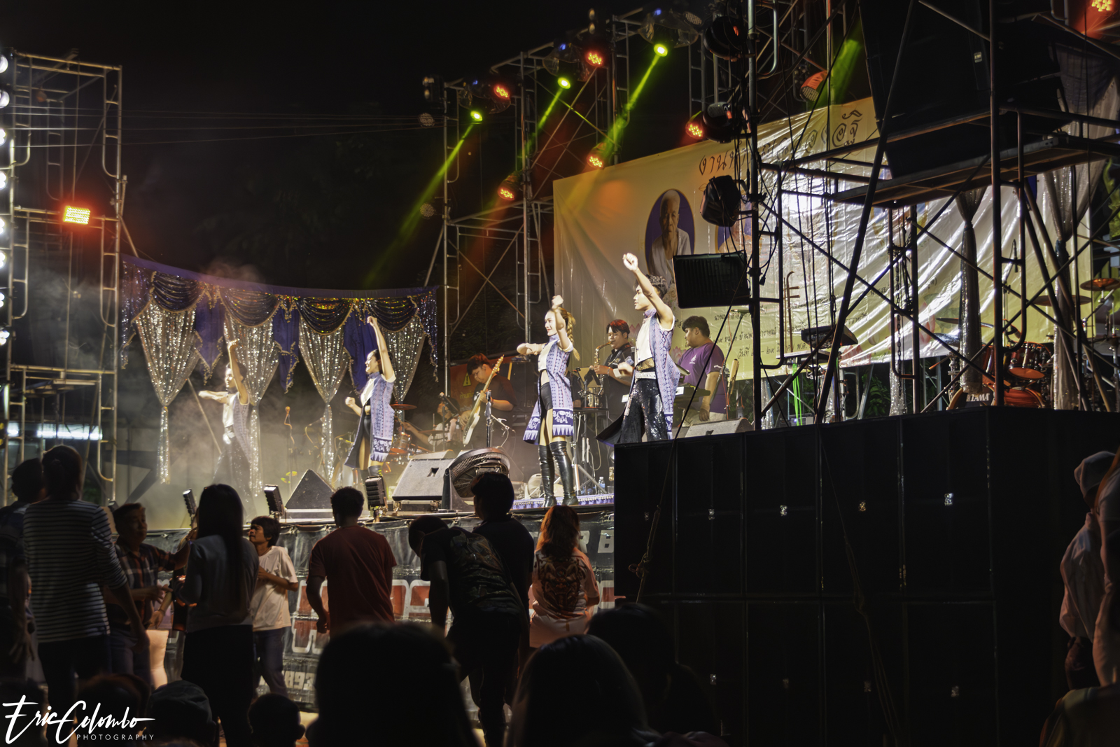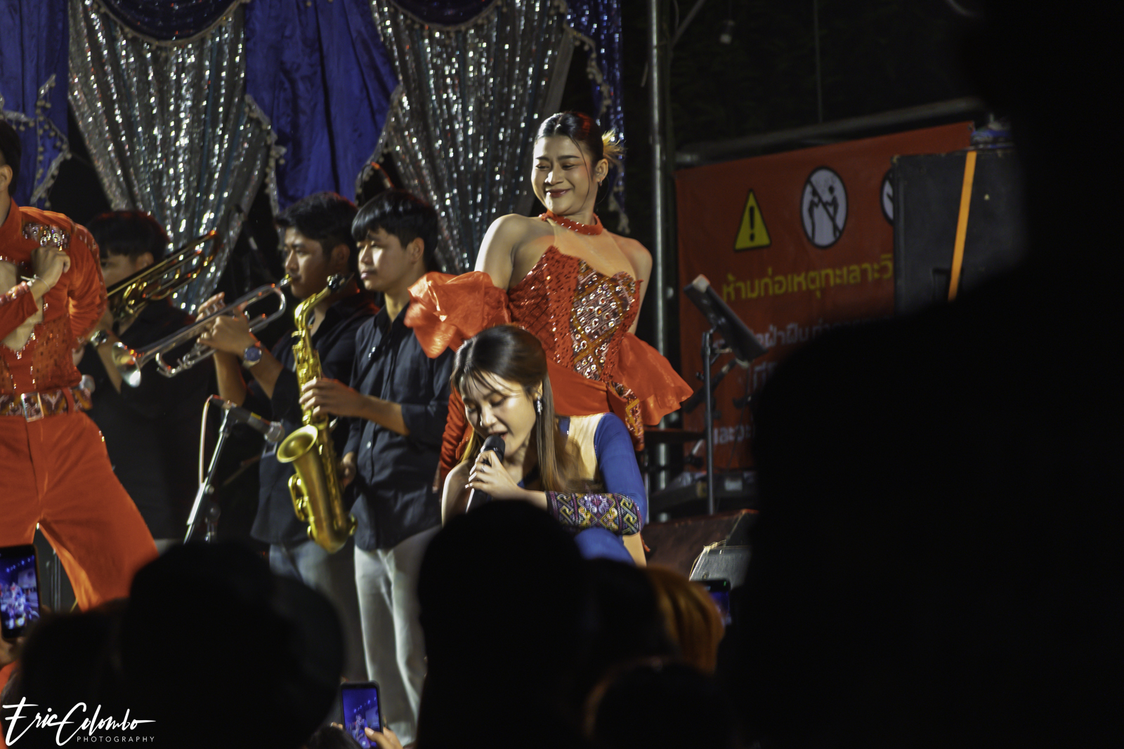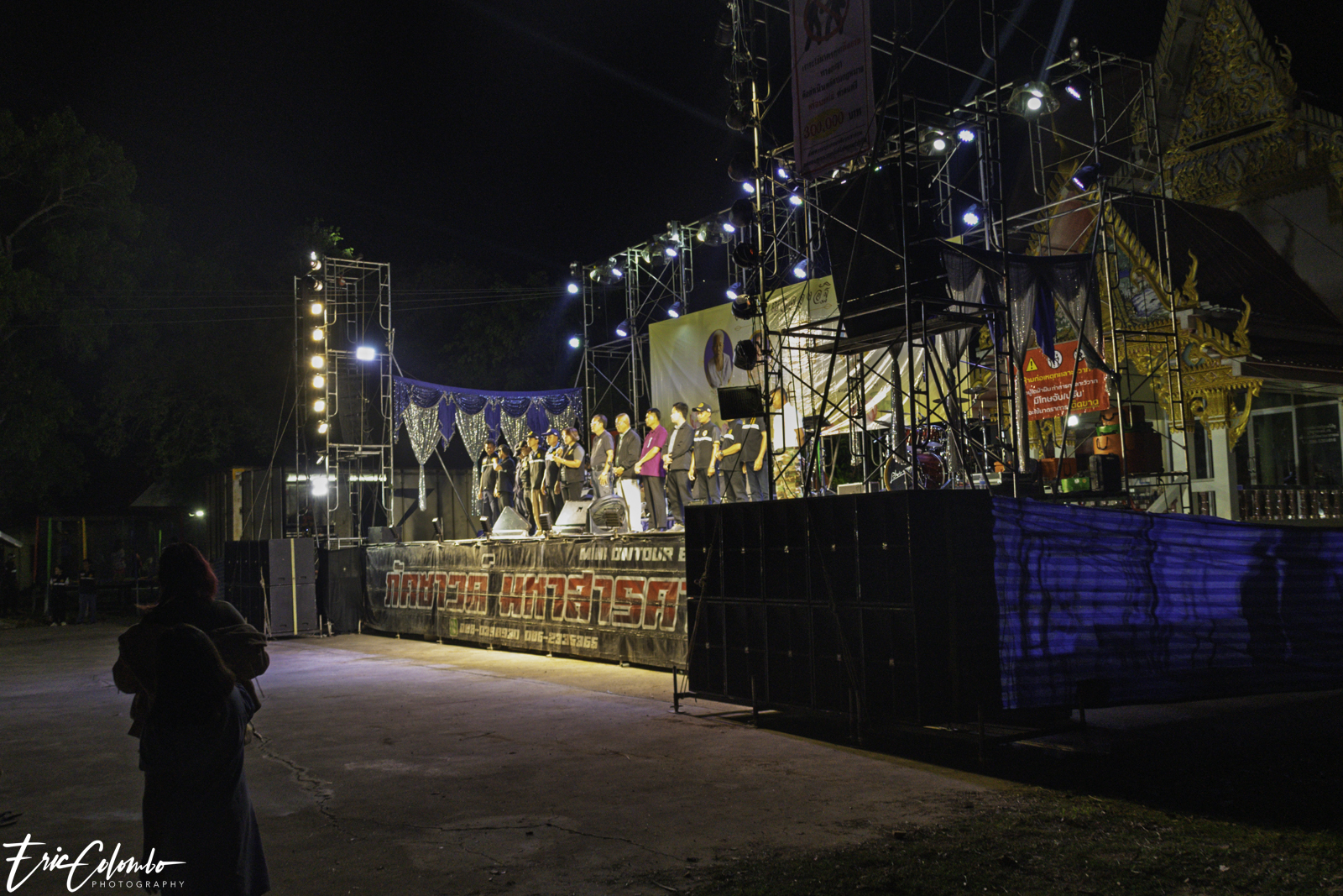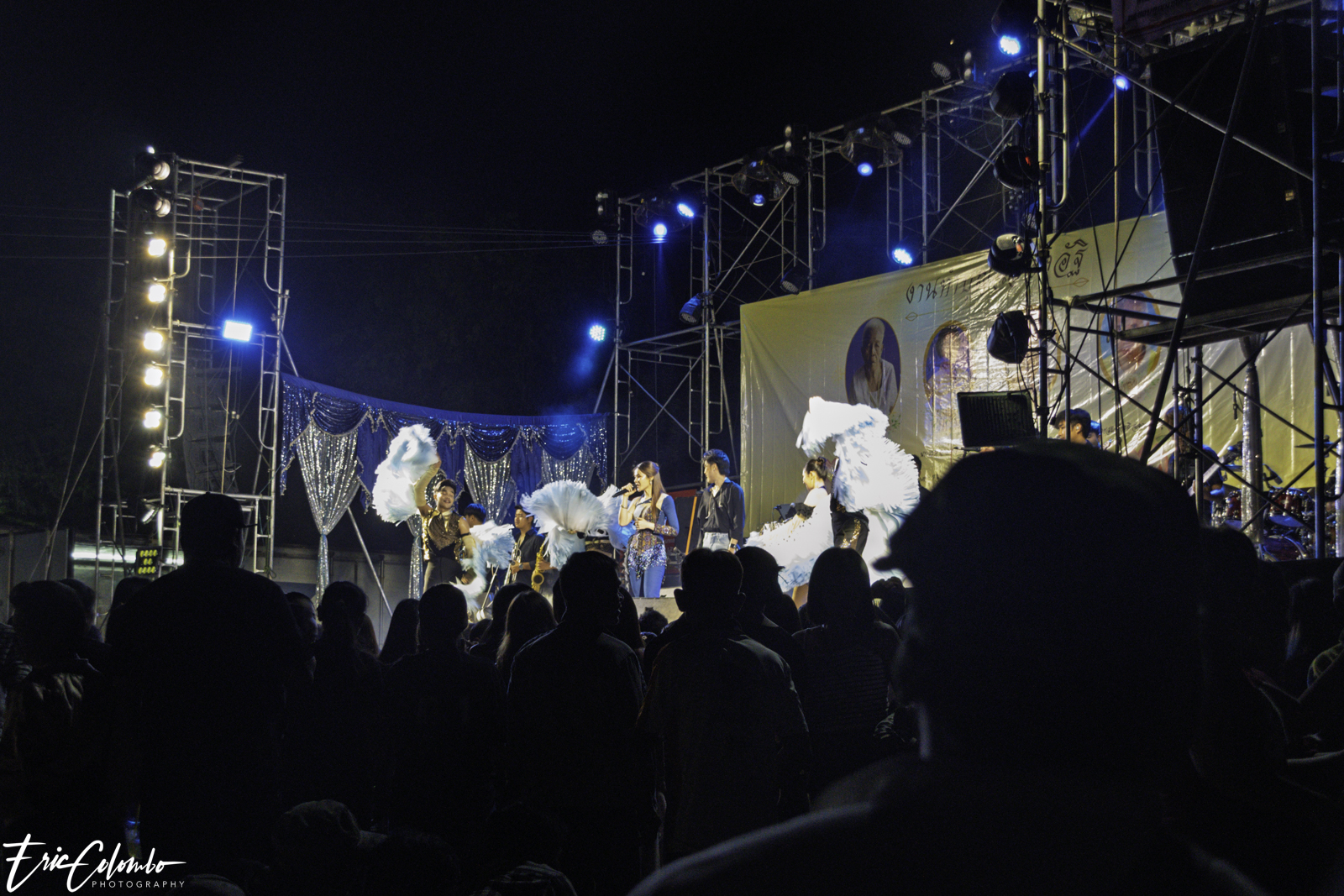Lors de la cérémonie de dispersion des cendres dans les monuments funéraires, ma belle-famille et moi avons offert aux habitants du petit village de Phra Narai un spectacle exceptionnel. Les célèbres chanteuses Vieng Narumon et Bow Dam Lam Sing (โบว์ดำ ลำซิ่ง), accompagnées de leurs troupes de danseurs et de musiciens, ont enchanté le public. Chaque artiste avait son propre groupe de danseurs et de musiciens, totalisant une quarantaine de personnes. Ils se partagent le matériel et le personnel technique pour le son et l'éclairage.