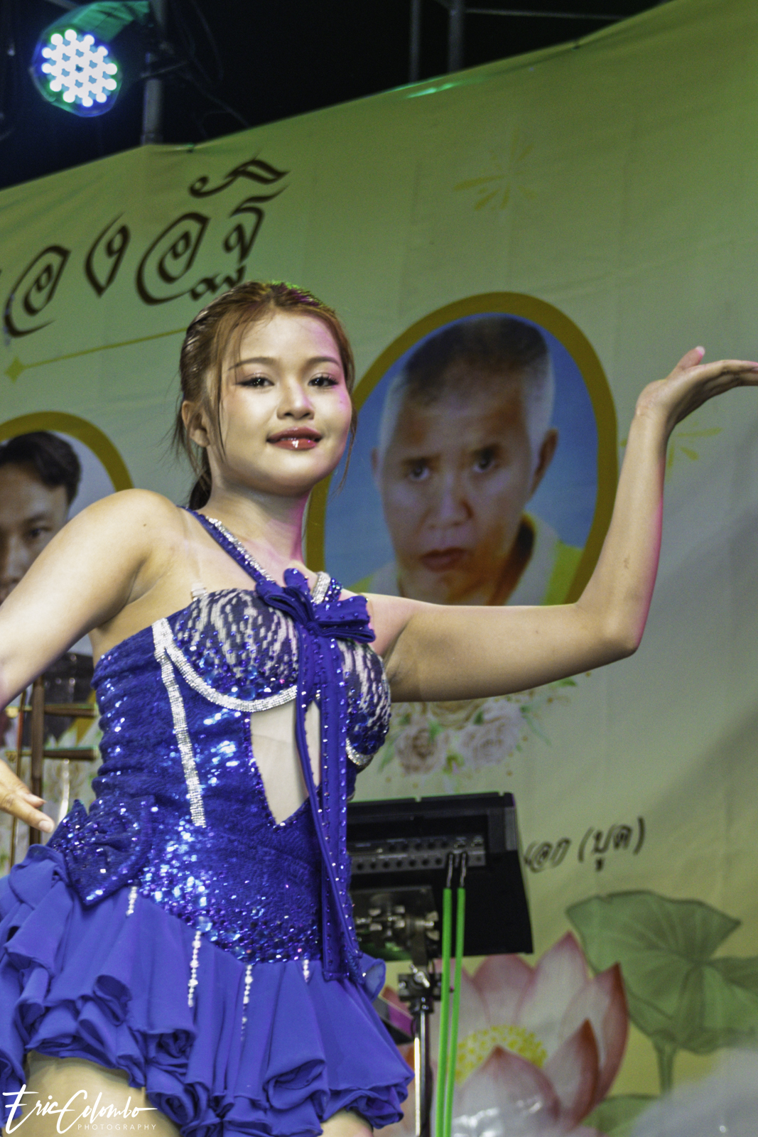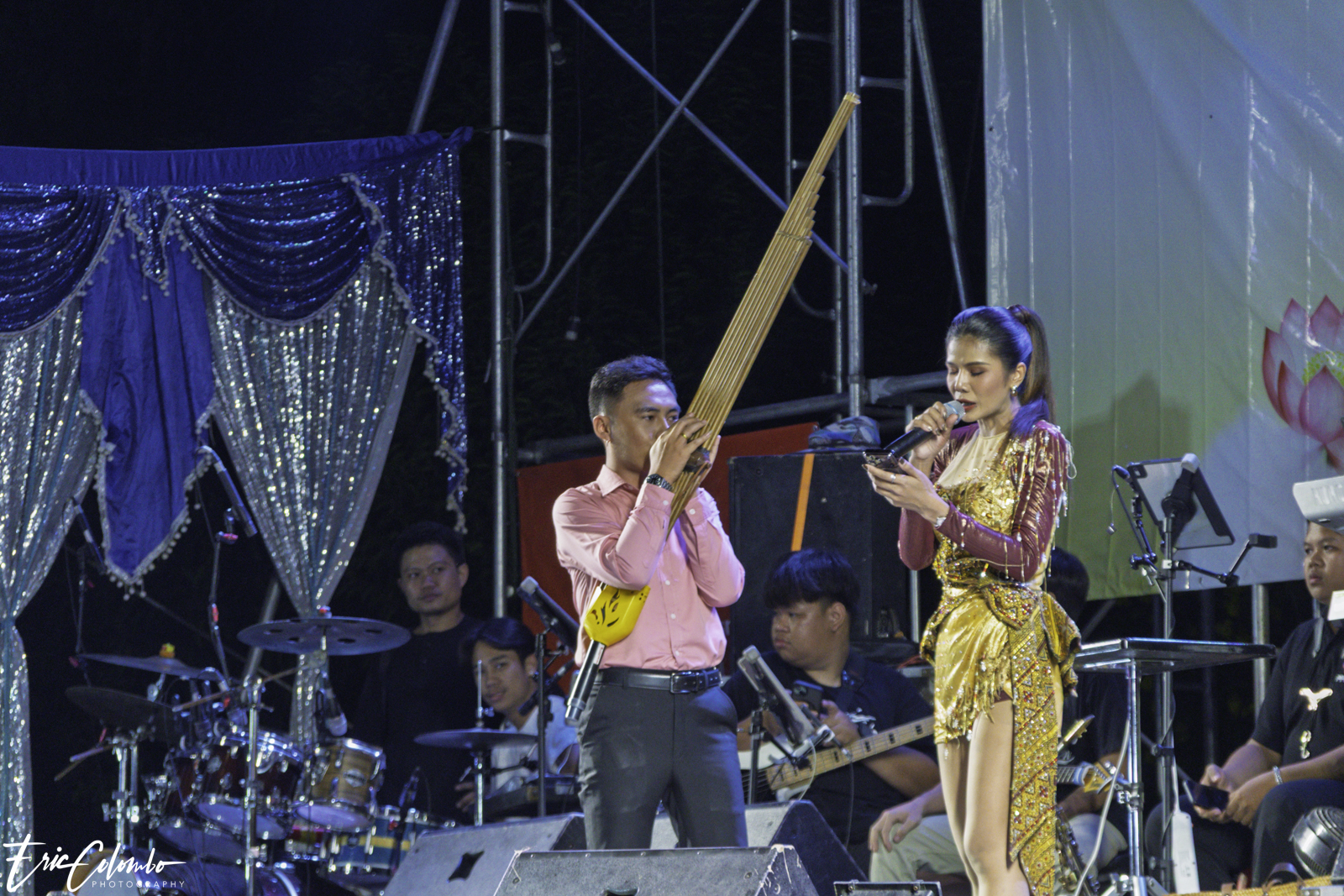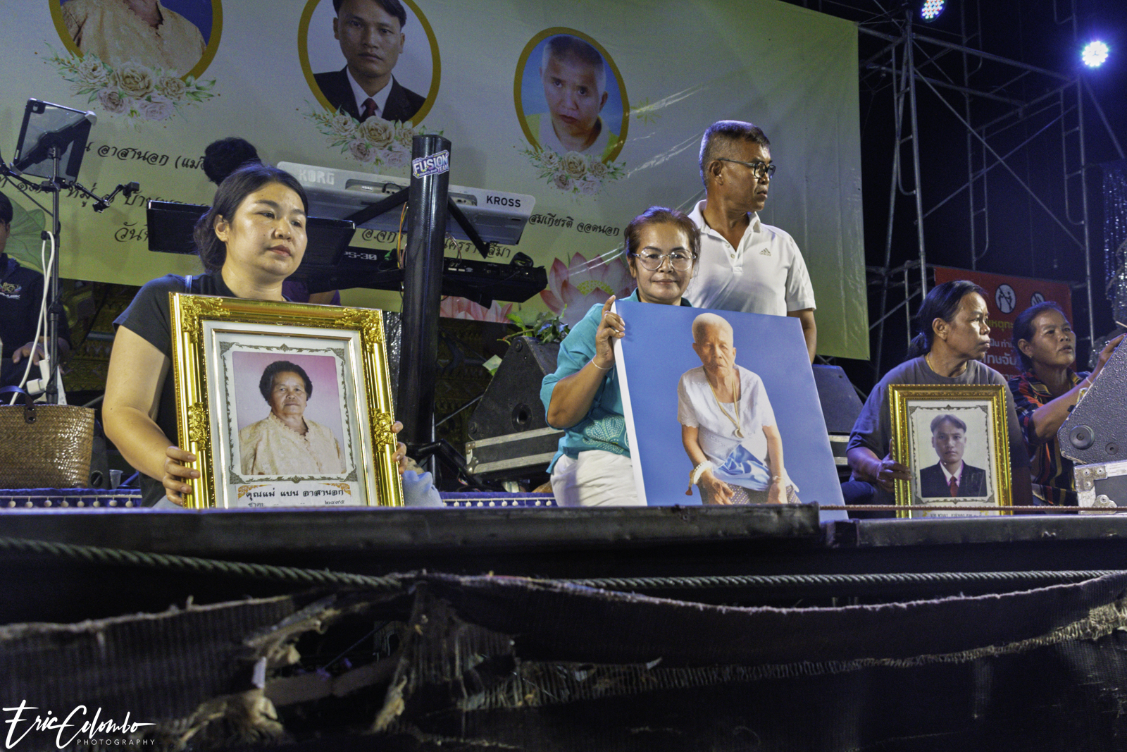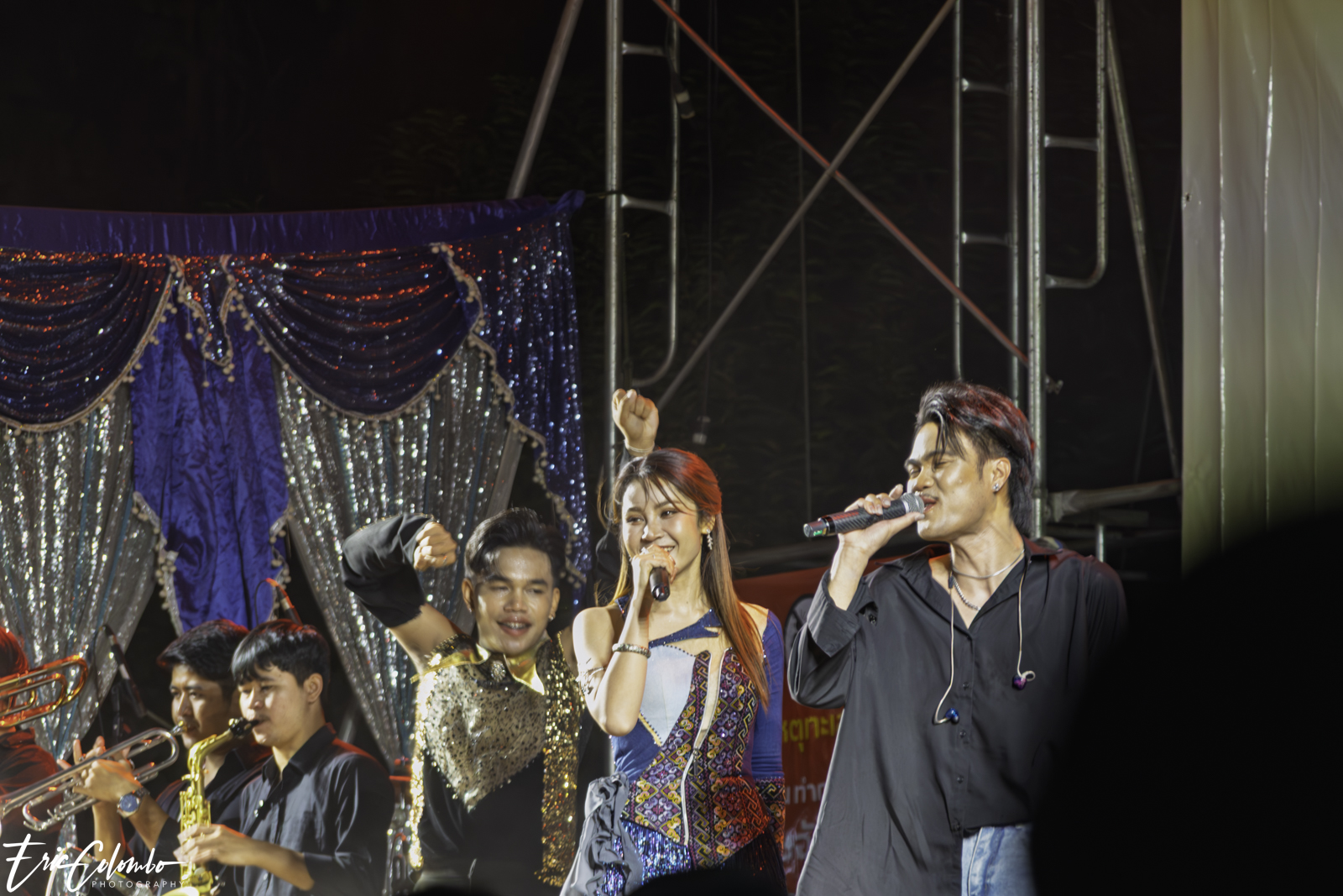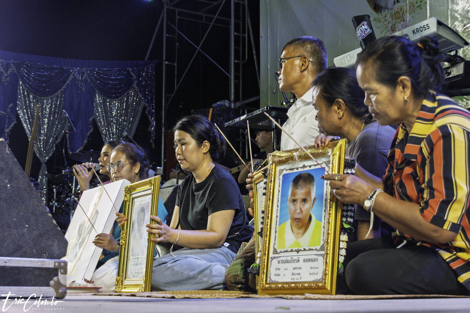 Lors de la cérémonie de dispersion des cendres dans les monuments funéraires, ma belle-famille et moi avons offert aux habitants du petit village de Phra Narai un spectacle exceptionnel. Les célèbres chanteuses Vieng Narumon et Bow Dam Lam Sing (โบว์ดำ ลำซิ่ง), accompagnées de leurs troupes de danseurs et de musiciens, ont enchanté le public. Chaque artiste avait son propre groupe de danseurs et de musiciens, totalisant une quarantaine de personnes. Ils se partagent le matériel et le personnel technique pour le son et l'éclairage.