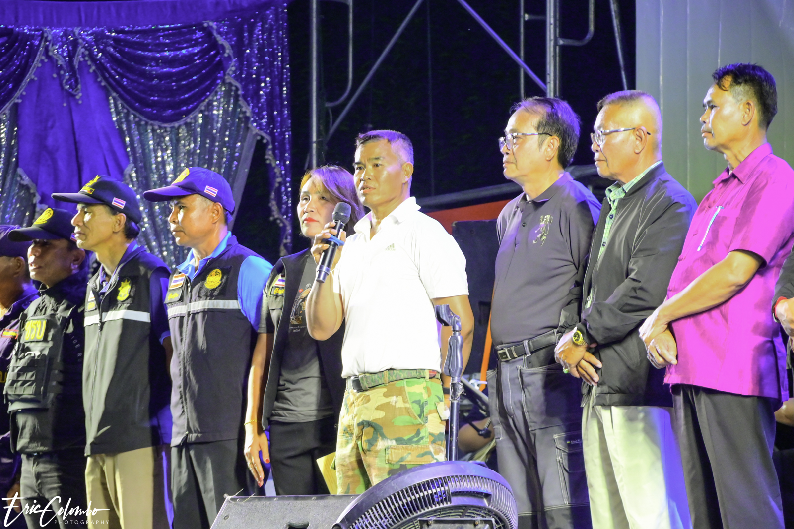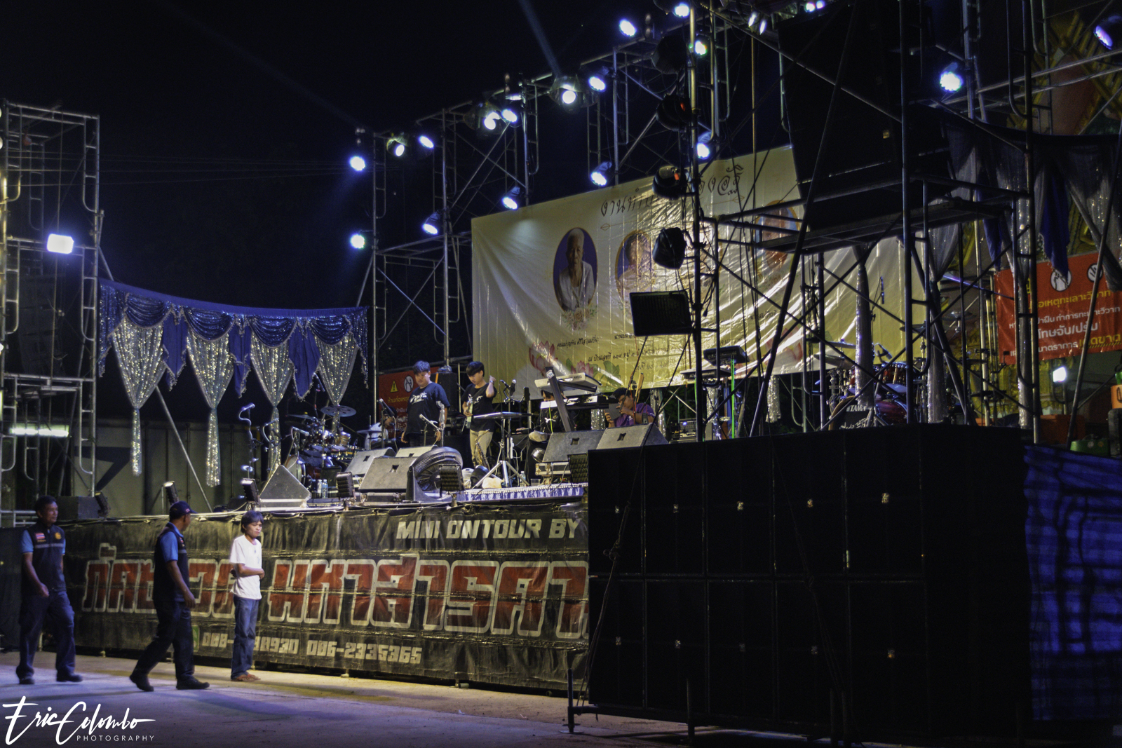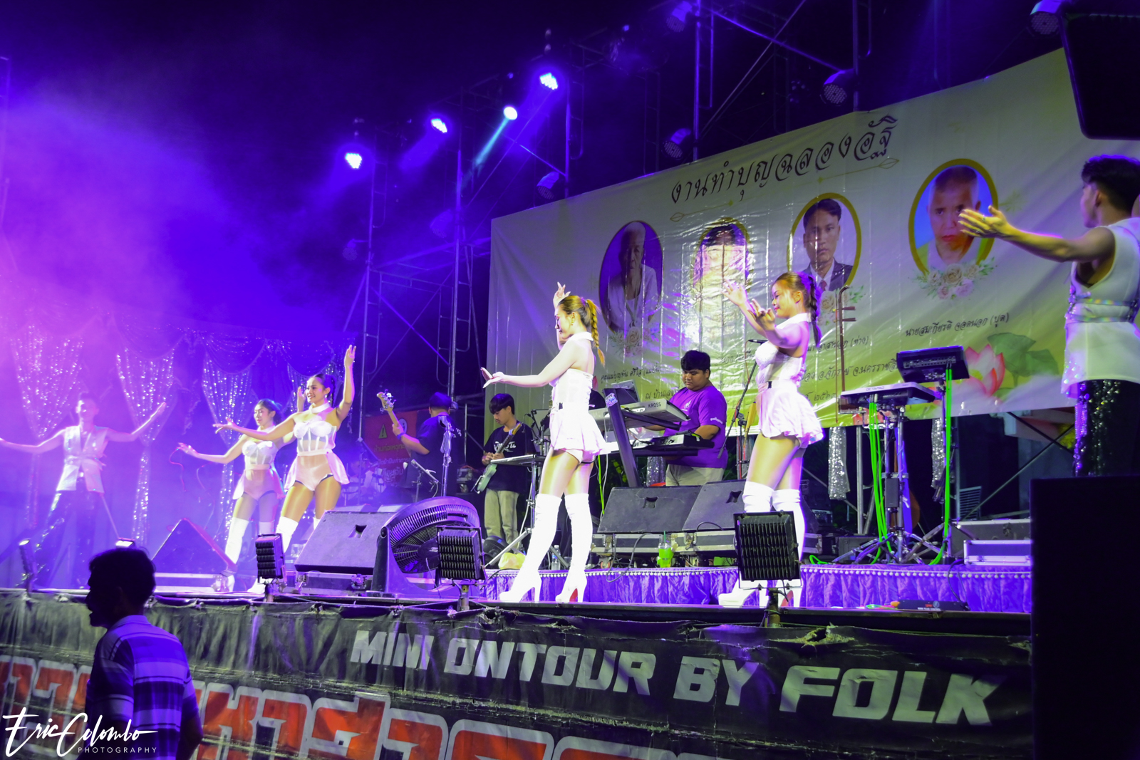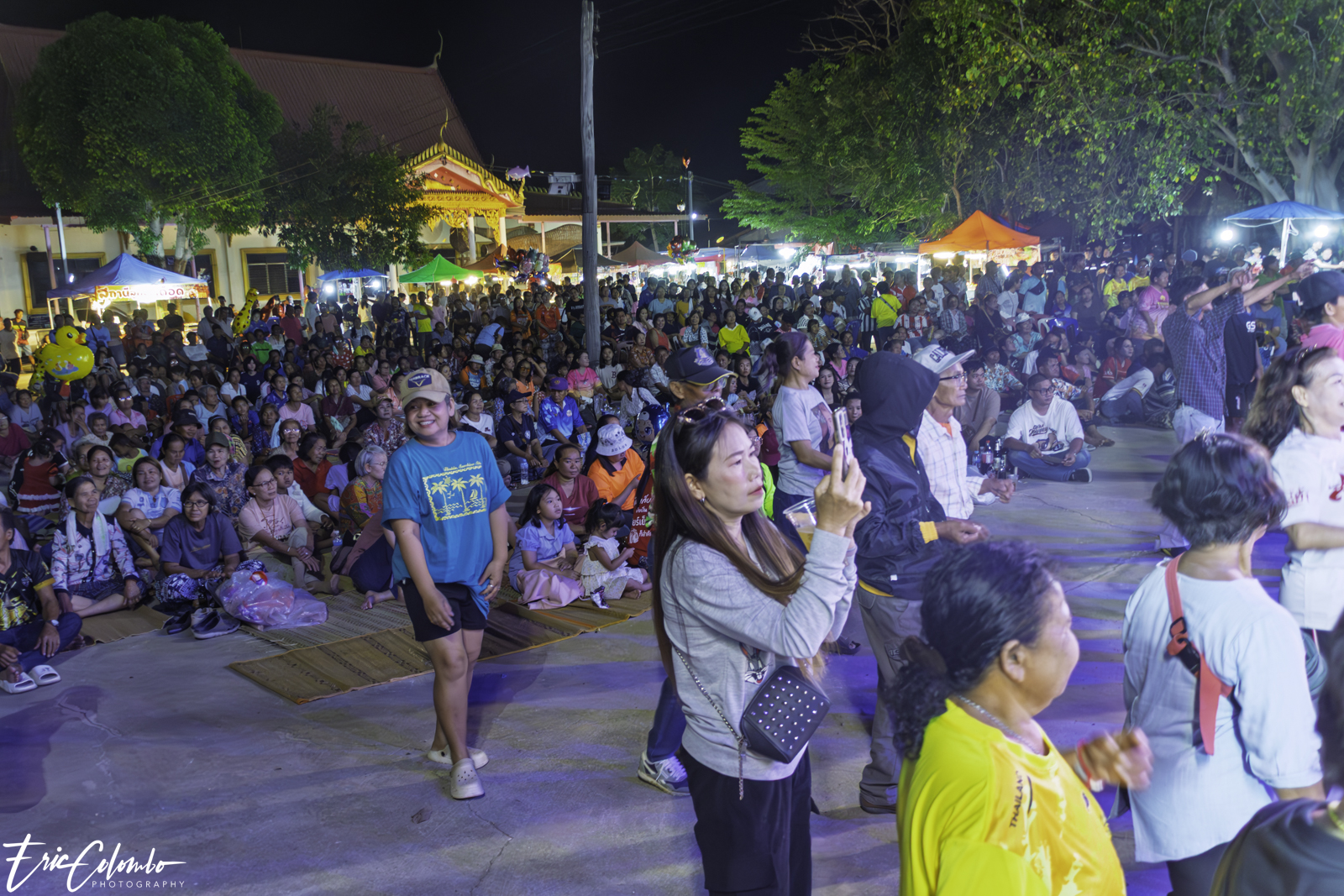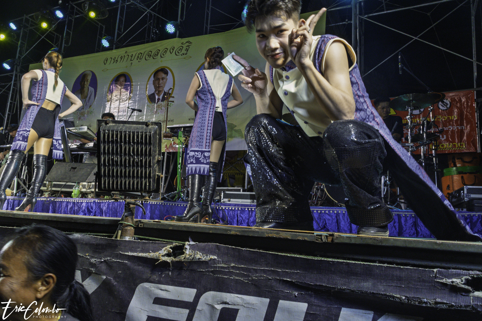 Lors de la cérémonie de dispersion des cendres dans les monuments funéraires, ma belle-famille et moi avons offert aux habitants du petit village de Phra Narai un spectacle exceptionnel. Les célèbres chanteuses Vieng Narumon et Bow Dam Lam Sing (โบว์ดำ ลำซิ่ง), accompagnées de leurs troupes de danseurs et de musiciens, ont enchanté le public. Chaque artiste avait son propre groupe de danseurs et de musiciens, totalisant une quarantaine de personnes. Ils se partagent le matériel et le personnel technique pour le son et l'éclairage.