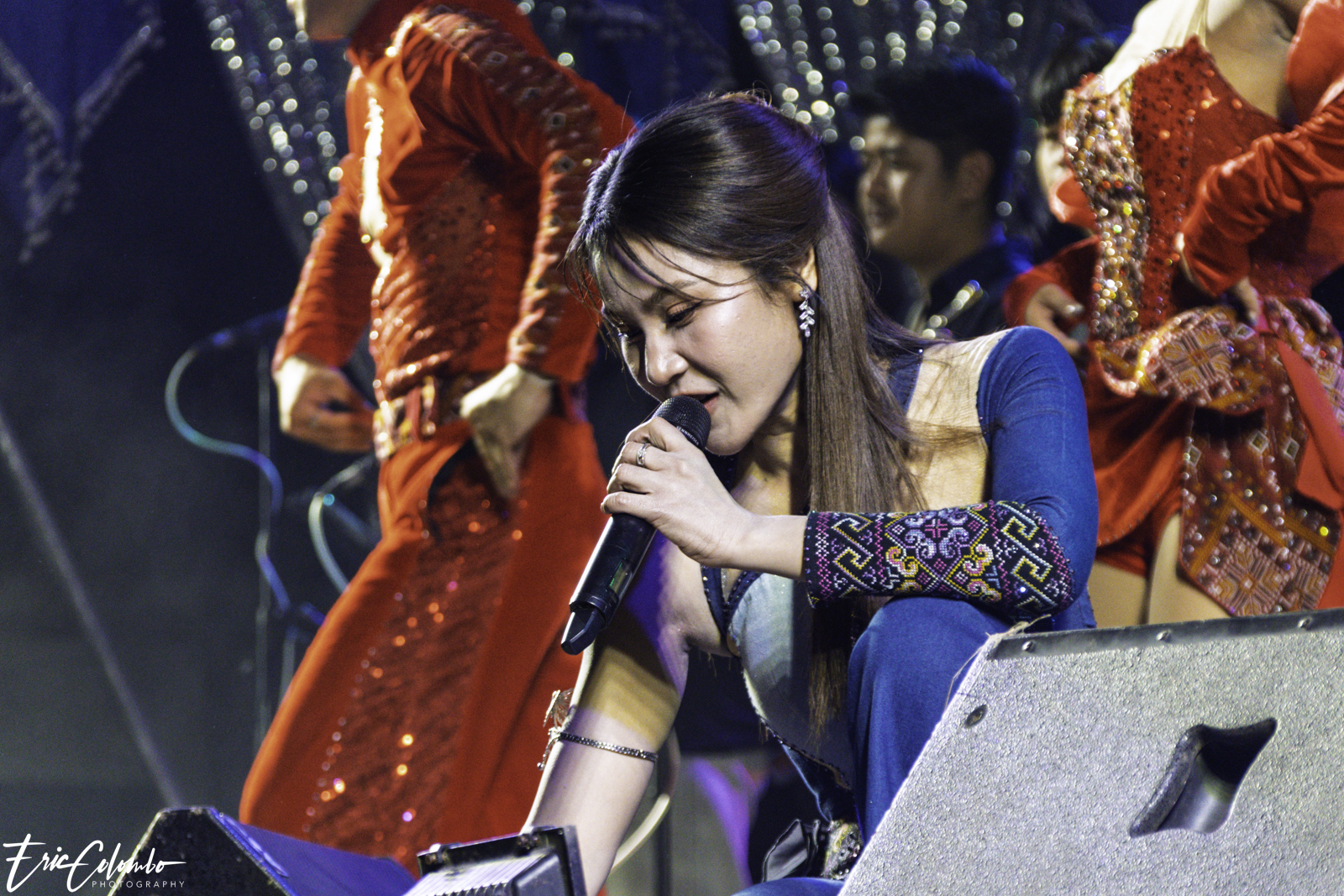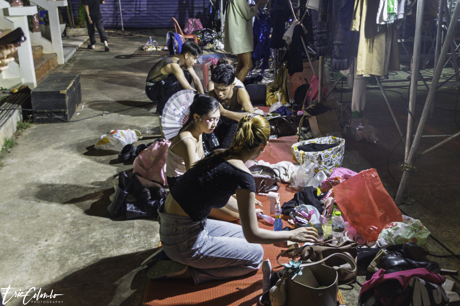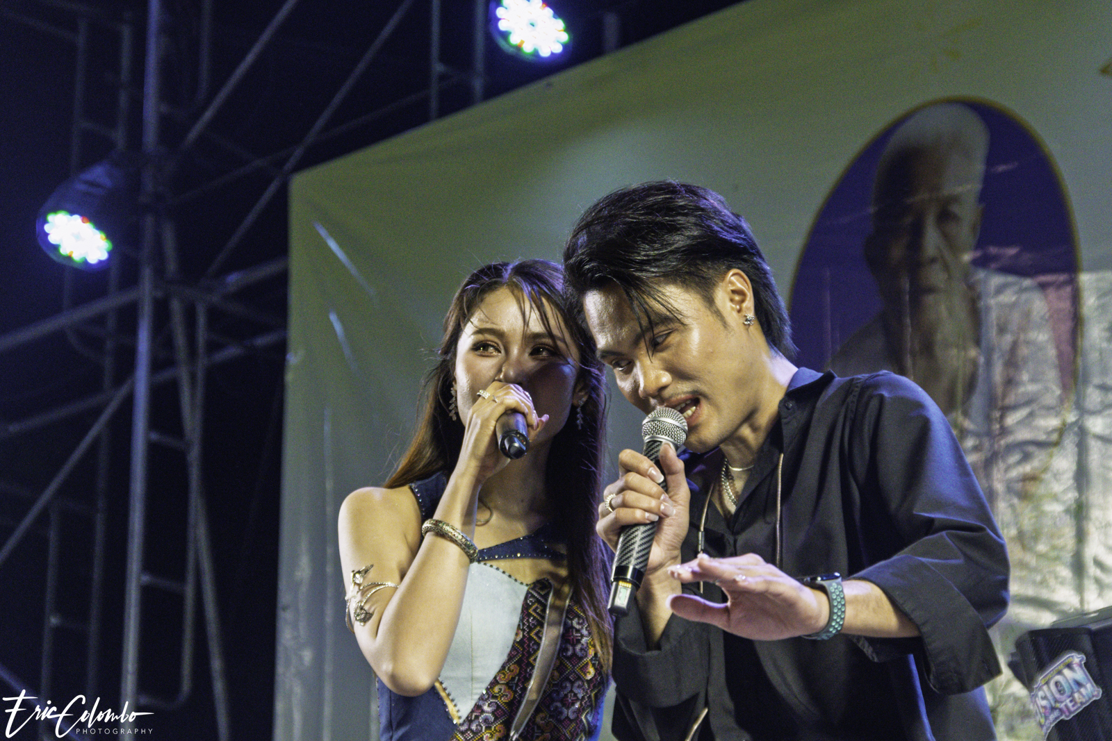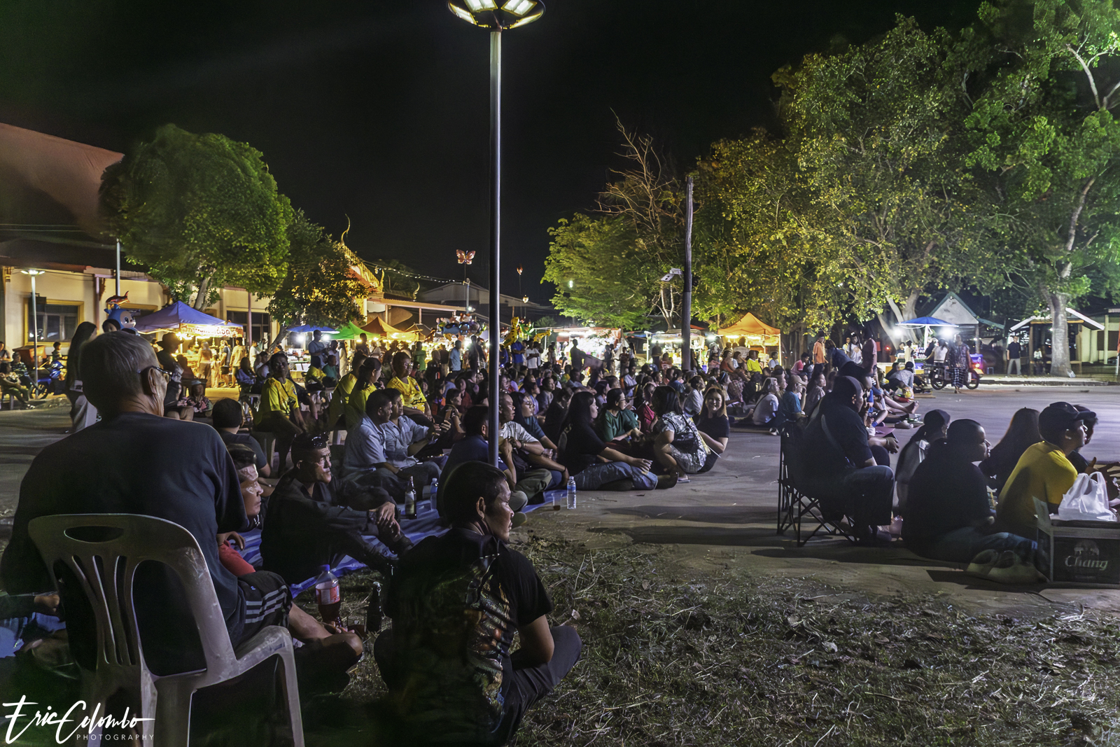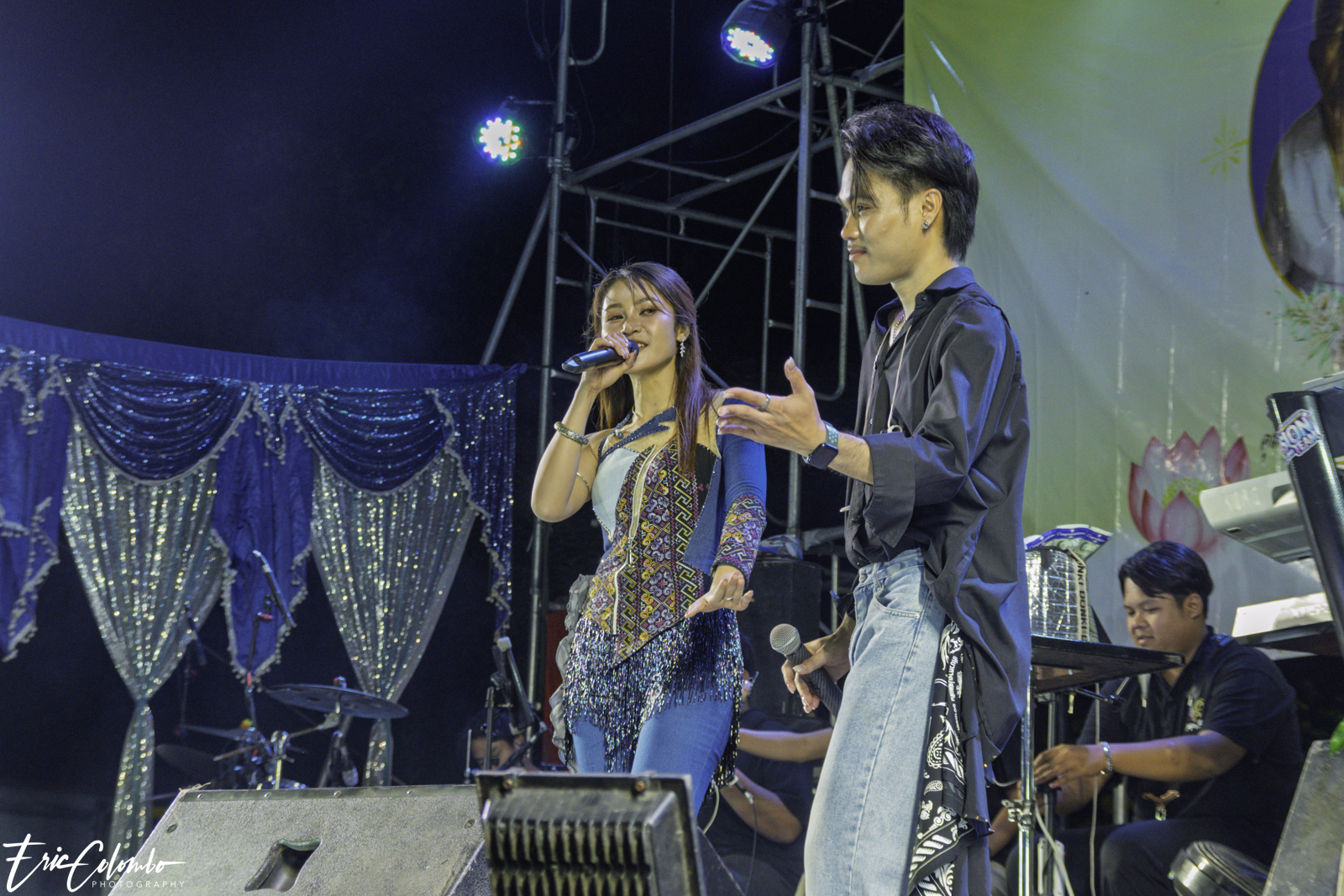 Lors de la cérémonie de dispersion des cendres dans les monuments funéraires, ma belle-famille et moi avons offert aux habitants du petit village de Phra Narai un spectacle exceptionnel. Les célèbres chanteuses Vieng Narumon et Bow Dam Lam Sing (โบว์ดำ ลำซิ่ง), accompagnées de leurs troupes de danseurs et de musiciens, ont enchanté le public. Chaque artiste avait son propre groupe de danseurs et de musiciens, totalisant une quarantaine de personnes. Ils se partagent le matériel et le personnel technique pour le son et l'éclairage.